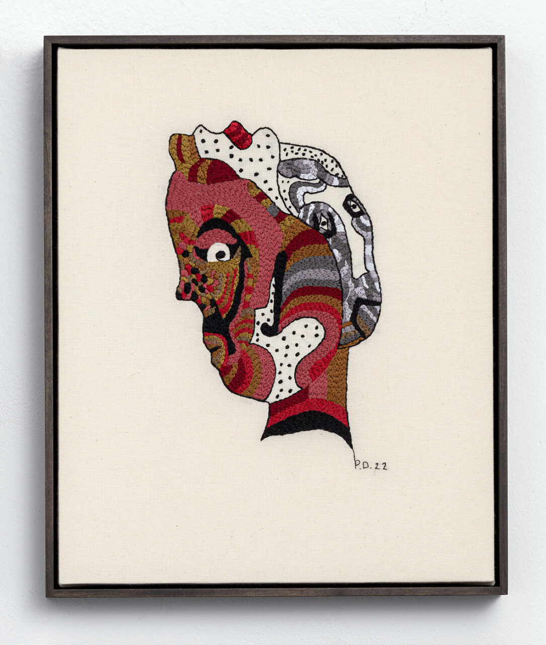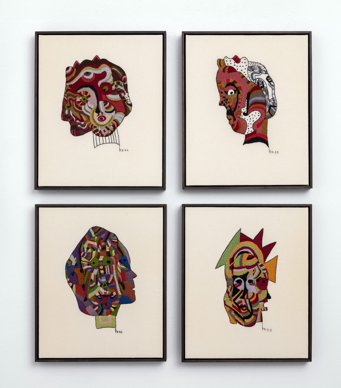 In this series of four hand-embroidered works, intertwined masks reveal faces that intersect, respond to one another, and sometimes fade away. Each head seems to whisper to the other, engaged in a silent dialogue where identities confront and merge.